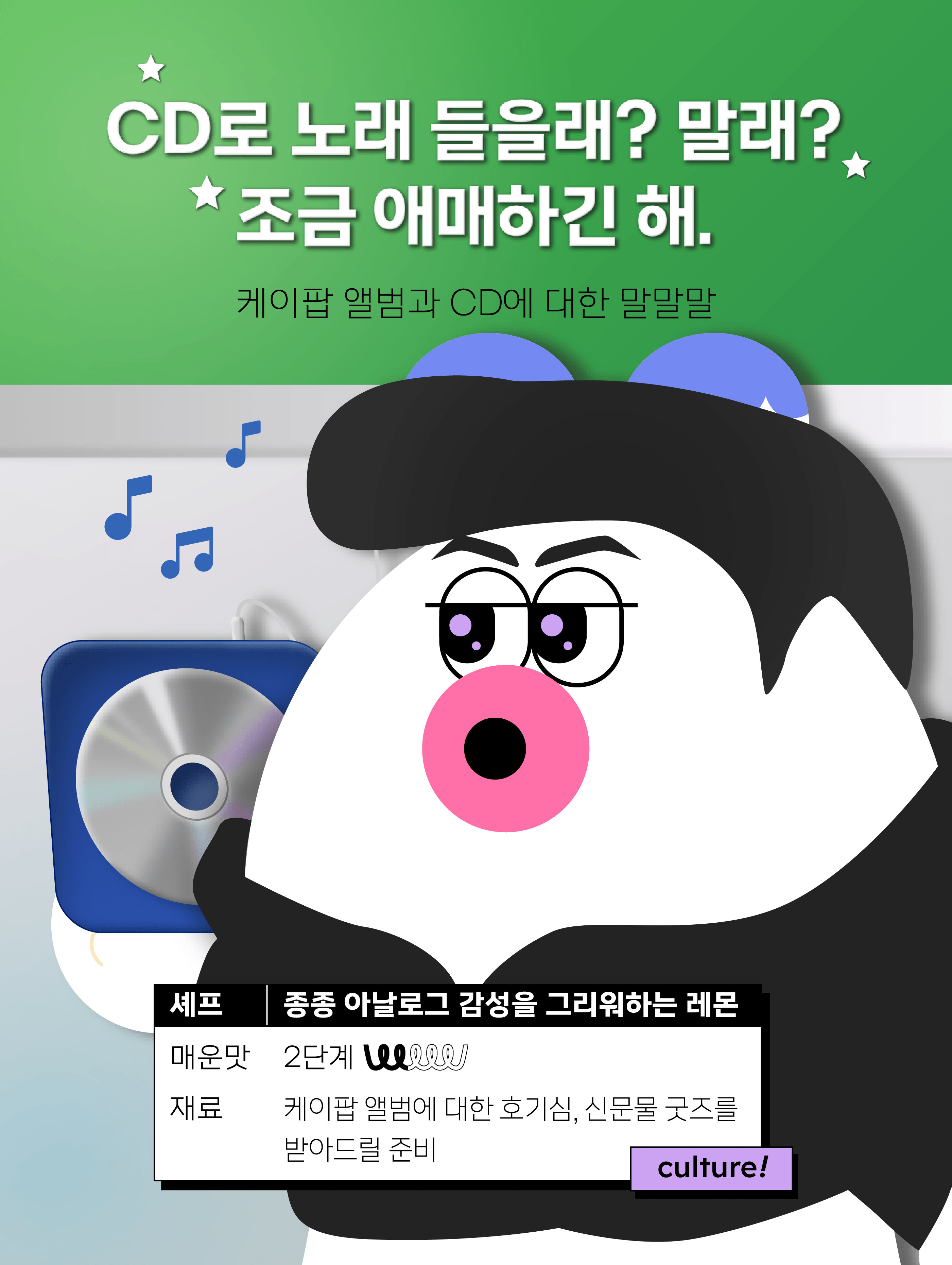 ์ฃผ๋ณ๋ง ๋ด๋ CD๋ฅผ ์ฌ์ํด์ ๋ฃ๋ ์ด๋ค์ด ๋ง์ด ์ฌ๋ผ์ง๊ณ ์์ง? ์ค์ํ์์๋ ์ฝ๊ฒ ์ฒด๊ฐํ ์ ์๋ ๋งํผ, ์ต๊ทผ ์ผ์ดํ ์์ฅ์์๋ CD๋ฅผ ๋ํ๋ ํ๋๊ฐ ๋ง์ด ๋ฐ๋๊ณ ์์ด. |