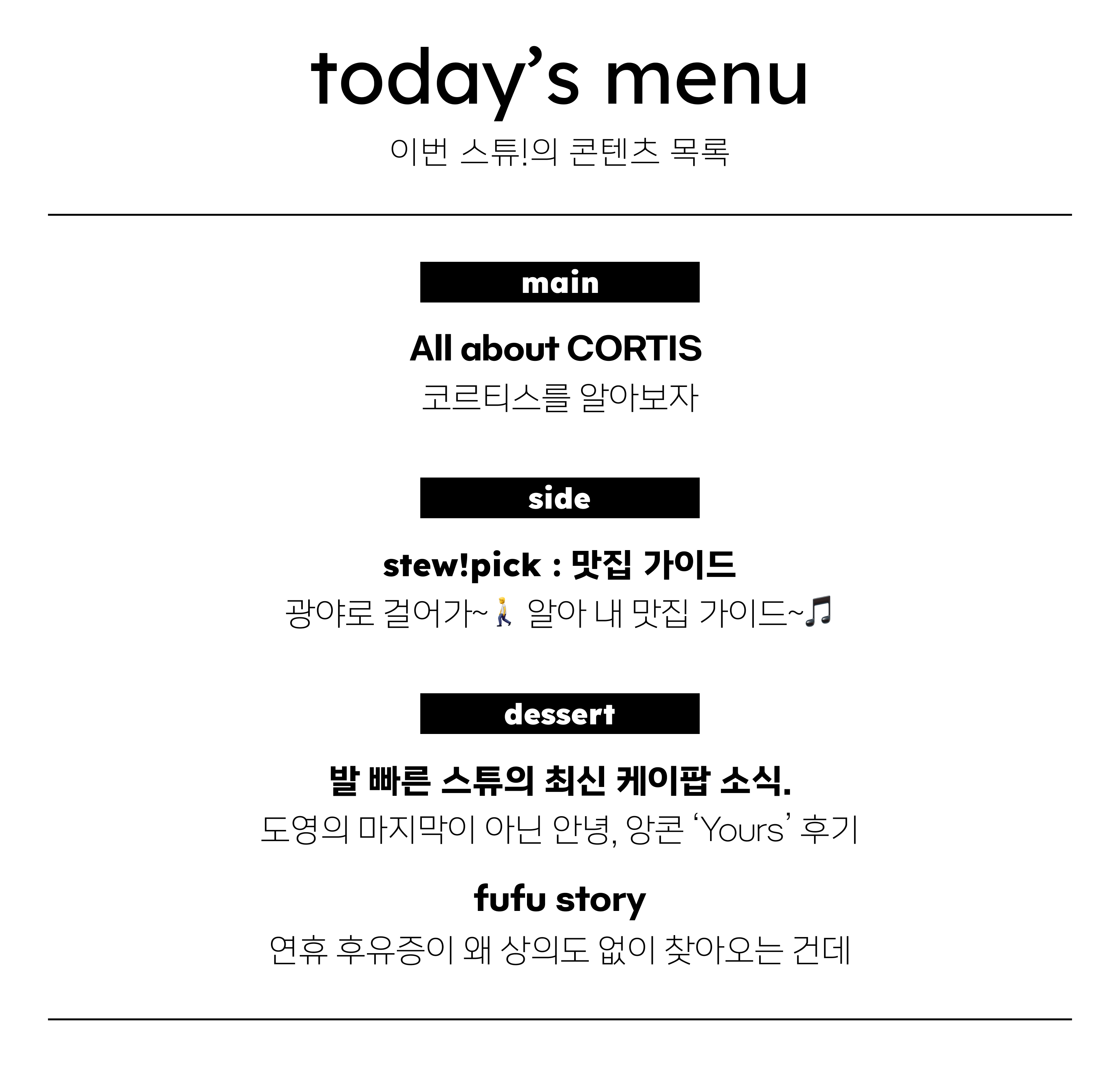 깊지는 않더라도 코르티스에 대해 꼭 알아야 할 것들은 다 알려준 것 같은데, 어땠어? 아직 코르티스 입덕 부정기를 겪고 있는 보글이가 있다면 오늘 입덕해.. 지금이 가장 빠를 때야... 나처럼 후회하지 말고! 다음에 또 기회가 된다면 코르티스에 대해 더 깊게 다뤄보도록 할게. |