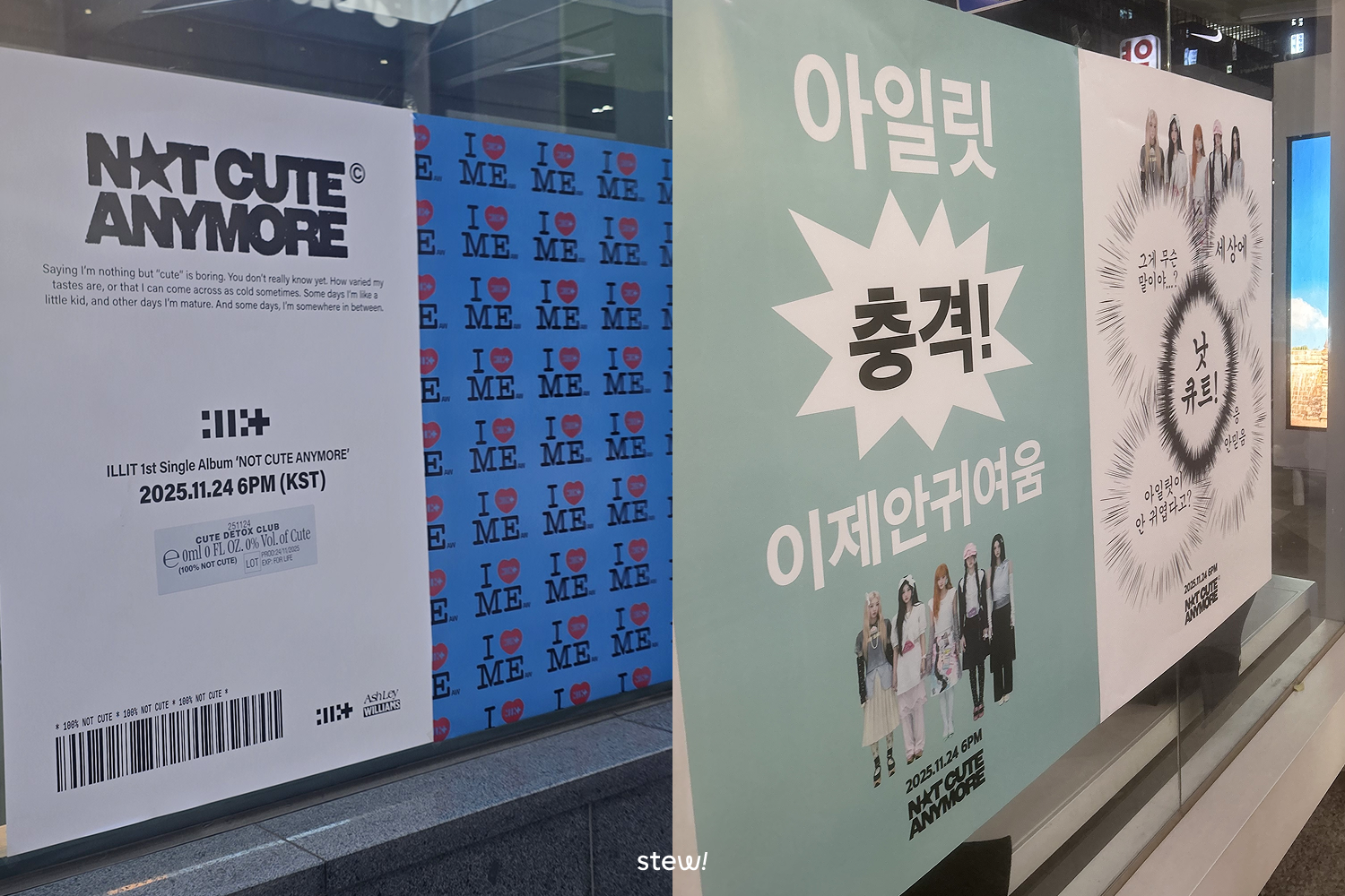 웬 ‘CUTE DETOX CLUB?’ 신논현역을 걷다가 라벨이 붙어있는 포스터를 마주쳤어. 들여다보니 나의 귀여운 아일릿이 이제 귀엽지 않겠다고 선언하는 포스터인 거야! 평소 보던 아일릿의 무드 보드와 다르게 확실히 차분한 느낌을 주는 디자인이라, 어떤 이야기를 앨범에 담아냈을지 기대되더라고. 그날로부터 일주일 뒤, 같은 자리에 다른 포스터가 붙어있었어. 바로 ‘충격! 아일릿 이제안귀여움’ 포스터! 이렇게 귀엽지 않음을 선언해도, 홍보 포스터에 적혀있듯 ‘응 안믿음’ 이라고 생각하게 되더라고. 아마 귀여운 사람들이 ‘난 이제 더 이상 귀엽지 않다’를 주장하는 것이 이번 앨범의 묘미려나? 귀여운 노래지만 귀엽지 않다고 주장하는 역설적인 노래일지, 아니면 정말 각 잡고 새로운 모습을 보여줄지 포스터만으로는 알쏭달쏭해서 더 좋았던 것 같아.