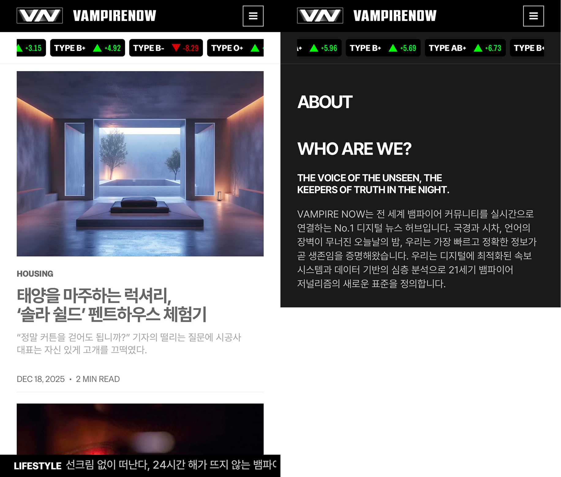뱀파이어와 사람 사이의 사랑을 이해하기 전에, 엔하이픈은 먼저 뱀파이어 세상의 이야기를 공개했어. 뱀파이어 전문 매체 ‘VAMPIRE NOW(이하 뱀파이어 나우)’에서는 요즘 뱀파이어 사회에서 논쟁이 되는 이슈부터, 핫한 트렌드, 면역 학회에서 성공한 임상 결과까지(!) 진짜 신문처럼 뱀파이어들의 삶을 아주 디테일하게 보여주고 있지. |