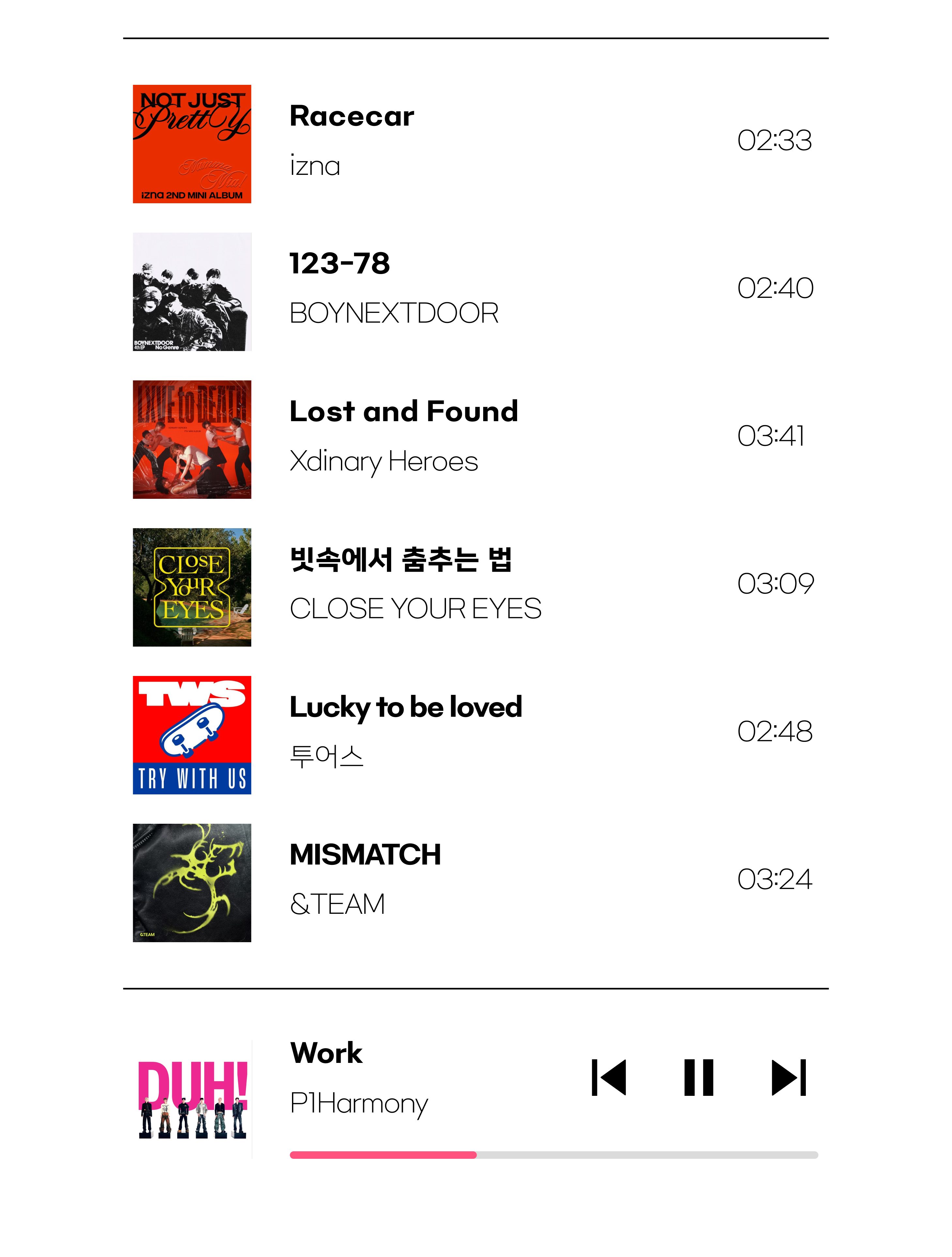 이렇게 수록곡 플리를 짜다 보니까 올해의 명반이 진짜 많았다는 걸 새삼 느꼈어. 플레이리스트엔 1곡씩만 담았지만 JENNIE ‘Ruby’, CLOSE YOUR EYES ‘ETERNALT’, XDINARY HEROES ‘LXVE to DEATH’, NMIXX ‘Fe3O4: FORWARD’, P1HARMONY ‘DUH!’, KickFlip ‘My First Flip’, 도영 ‘Soar’... 거를 타선 없이 앨범 전체가 보석 같은 작품들이었어. 어머... 나 왜 이렇게 케이팝을 사랑해?
