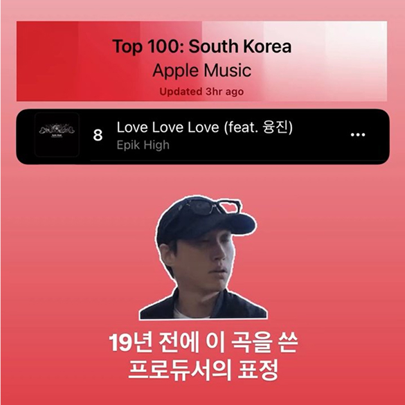 이번 에픽하이의 <Love Love Love>의 상승세에 불을 짚인 건 후배 아티스트인 식케이(Sik-K)의 공이 컸어. 2025년 3월, 식케이가 발매한 <LOV3>에 이 곡을 샘플링하면서, 에픽하이를 잘 몰랐던 젊은 힙합 팬들도 원곡으로 대거 유입됐거든. 여기에 틱톡, 쇼츠, 릴스 등 각종 SNS에서 가사에 맞춰 하트를 만드는 안무 챌린지가 유행하면서 대중들에게 <Love Love Love>의 존재감을 다시금 각인 시켰지. |