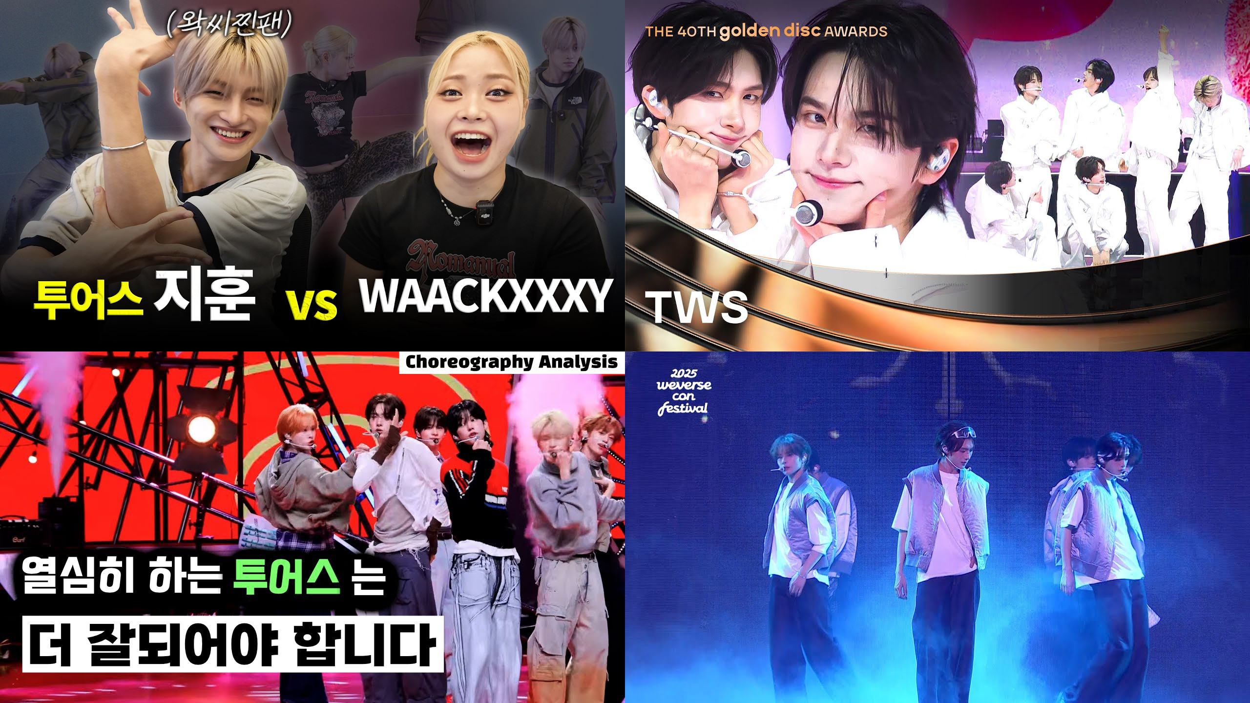 지금 당장 투어스의 무대 하나만 추천해야 한다면, 올해 골든디스크 무대를 보여주고 싶어. 2025년에 활동한 3개의 타이틀곡을 모두 보여줬거든! 일본 활동곡의 번안 버전을 처음 공개한 무대이기도 하고, 투어스의 색깔을 확실하게 각인시킨 연말 무대였던 것 같아.