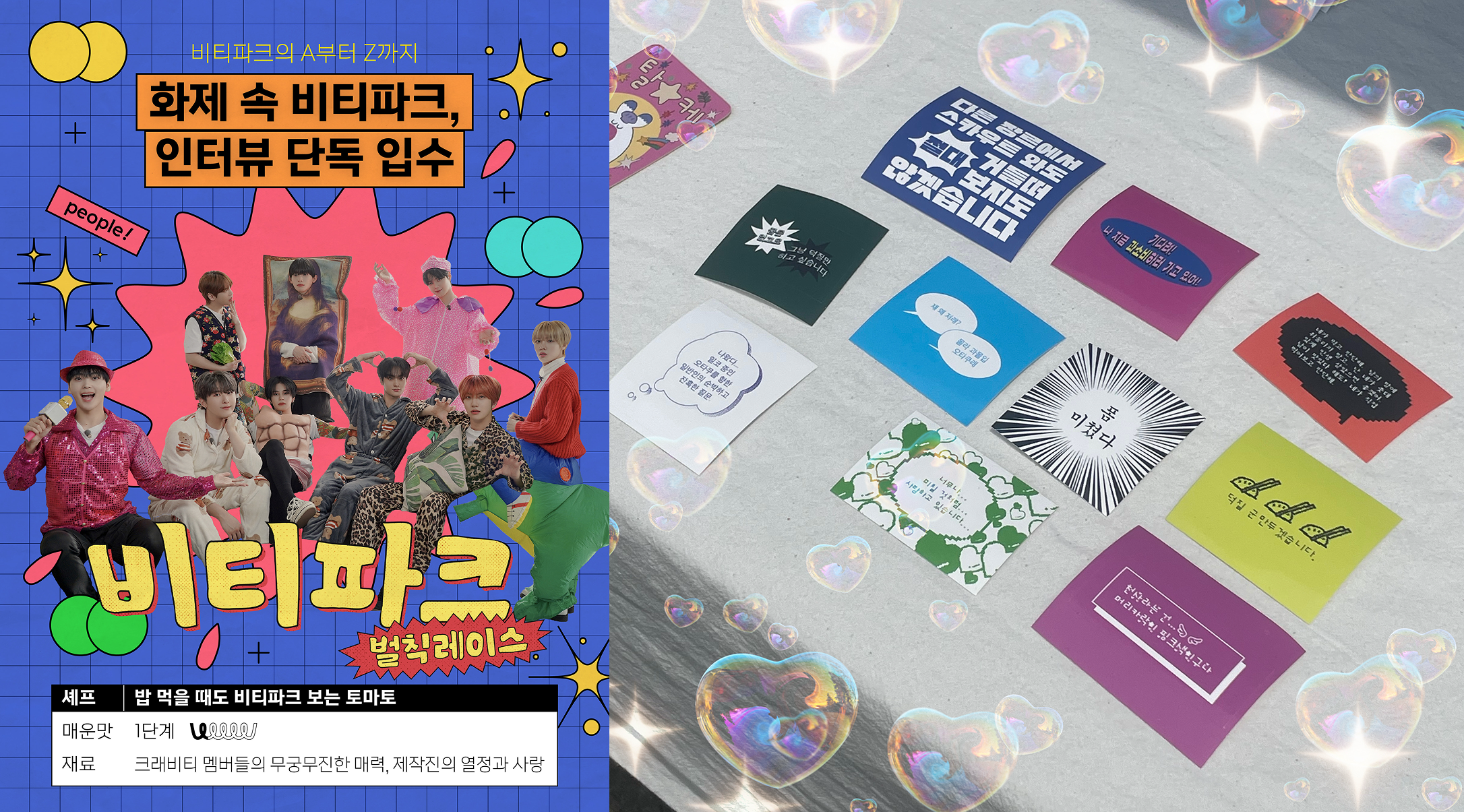 (좌) 토마토가 메인으로 협업했던 '비티파크 콘텐츠', (우) 오프라인 행사에서 판매한 '케이팝 밈 스티커'야. |
