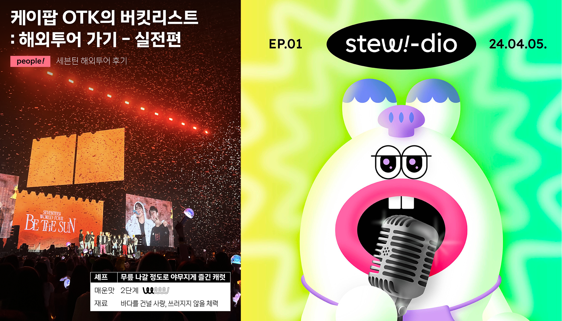 캐럿🥕: 스튜 덕분(?)에 ‘해외투어’ 버킷리스트를 이룬 적이 있어. 싱가포르에 가서 세븐틴도 보고, 식도락도 즐기고! 어렸을 때부터 해외투어의 로망이 있었는데 이런 내용을 콘텐츠로도 남길 수 있어서 좋았던 거 같아. 아 또 해외여행 가고 싶다~