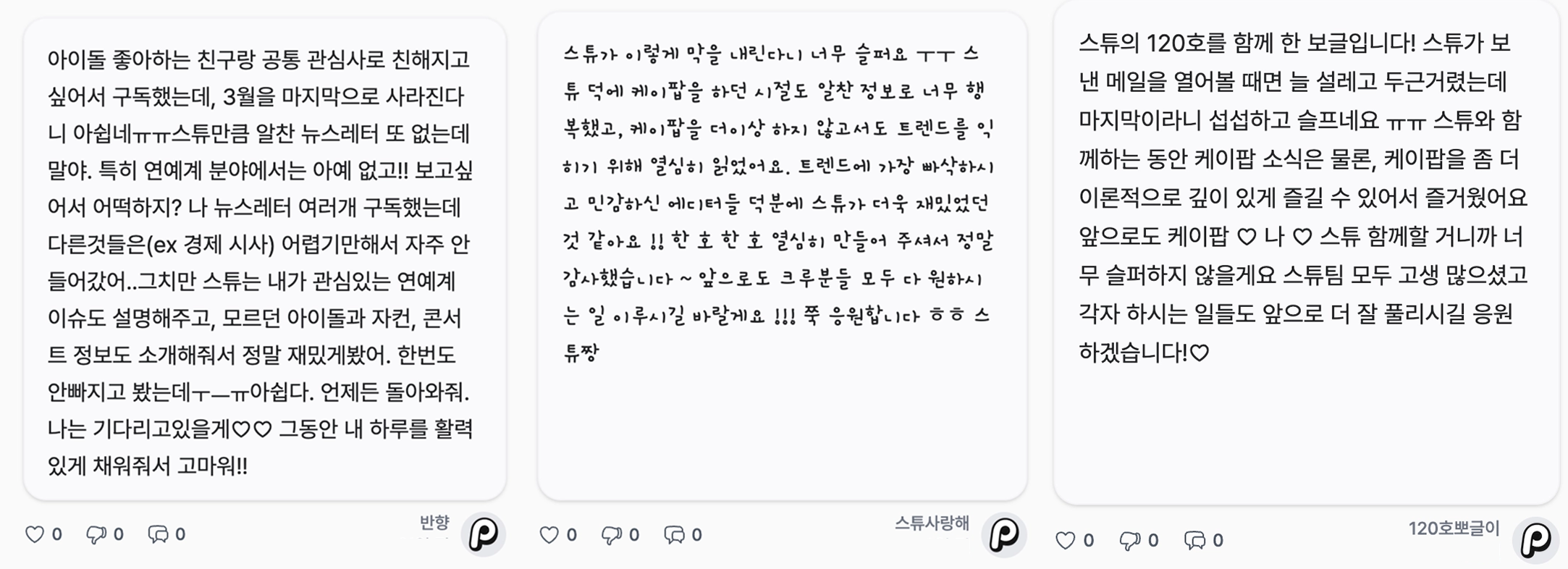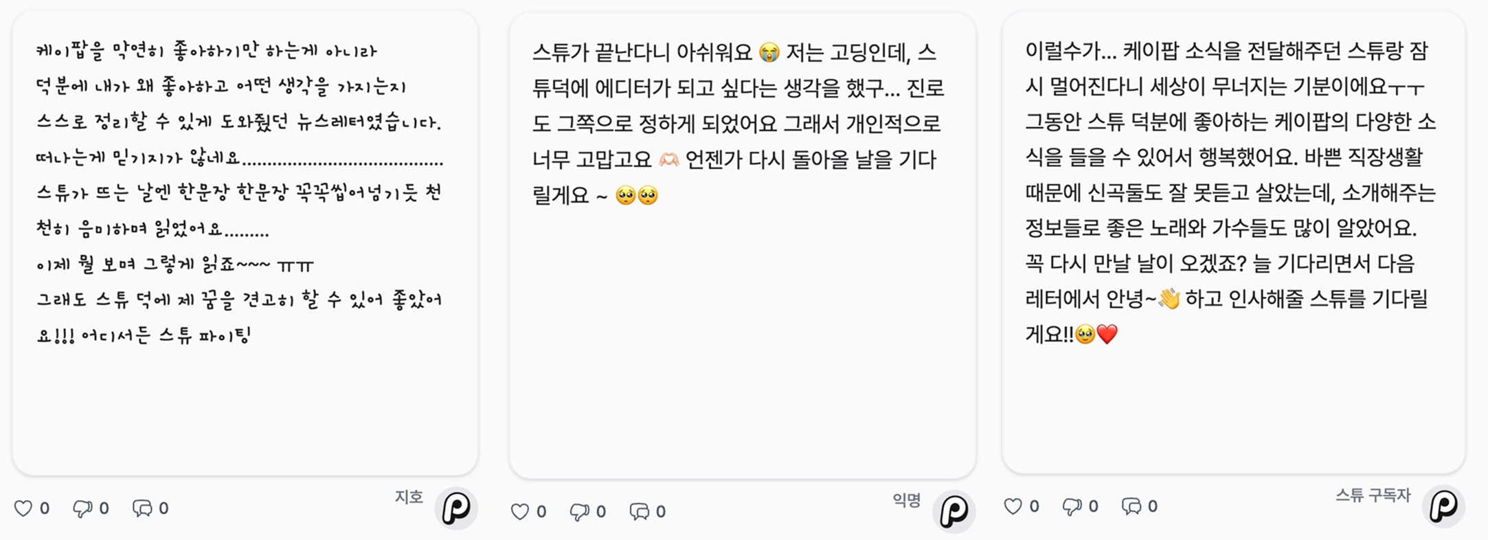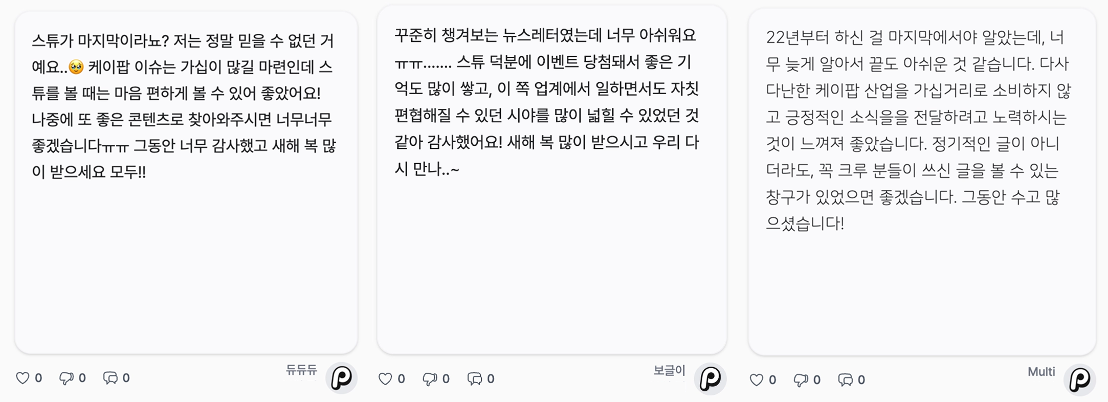 스튜의 콘텐츠를 긍정적으로 봐줘서 너무 고마워. 위 캡쳐에 보글이들이 말한 것처럼, 케이팝 산업 자체가 가십거리로 소비하기 쉬워서 우리도 늘 글을 쓸 때 너무 가볍게 소비되지 않기를 바라면서 콘텐츠를 제작했거든. 근데 그런 우리의 노력이 빛을 본 거 같아서 기뻐. 크루들 모두 어디선가 사부작사부작 콘텐츠를 만들 수도 있으니, 나중에 기회가 닿으면 우리 또 다시 만나자!
