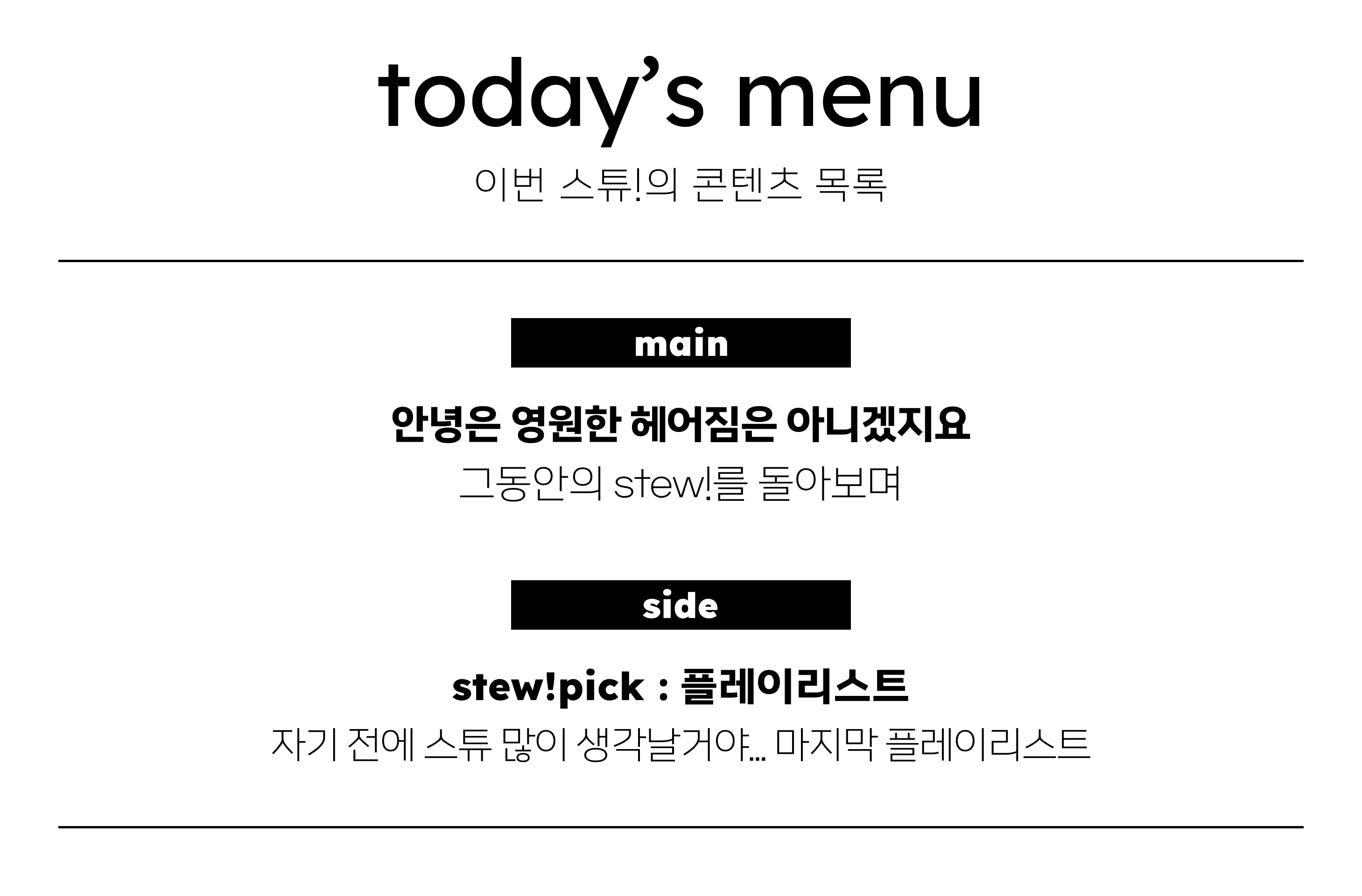 stew!가 마무리된다는게 아직은 실감이 잘 나지 않아요. 돌이켜보면 제게도 참 감사한 시간으로 남아 있습니다. 스튜를 끓이면서 제가 정말 좋아하는 것들을 콘텐츠로 담아낼 수 있었고, 그 콘텐츠를 통해 많은 사랑을 받아 더욱 기쁘고 뜻깊었습니다. 그동안 함께 애써준 크루들에게 진심으로 고맙고, 늘 스튜를 아껴주신 보글이들에게도 깊이 감사드립니다. stew!는 여기서 마무리되지만, 함께했던 시간은 오래도록 따뜻한 추억으로 남을 것 같아요. 앞으로 우리가 어떤 모습으로, 어디에서 다시 만나게 될지는 모르겠지만, 모두 각자의 자리에서 행복하셨으면 좋겠습니다.
